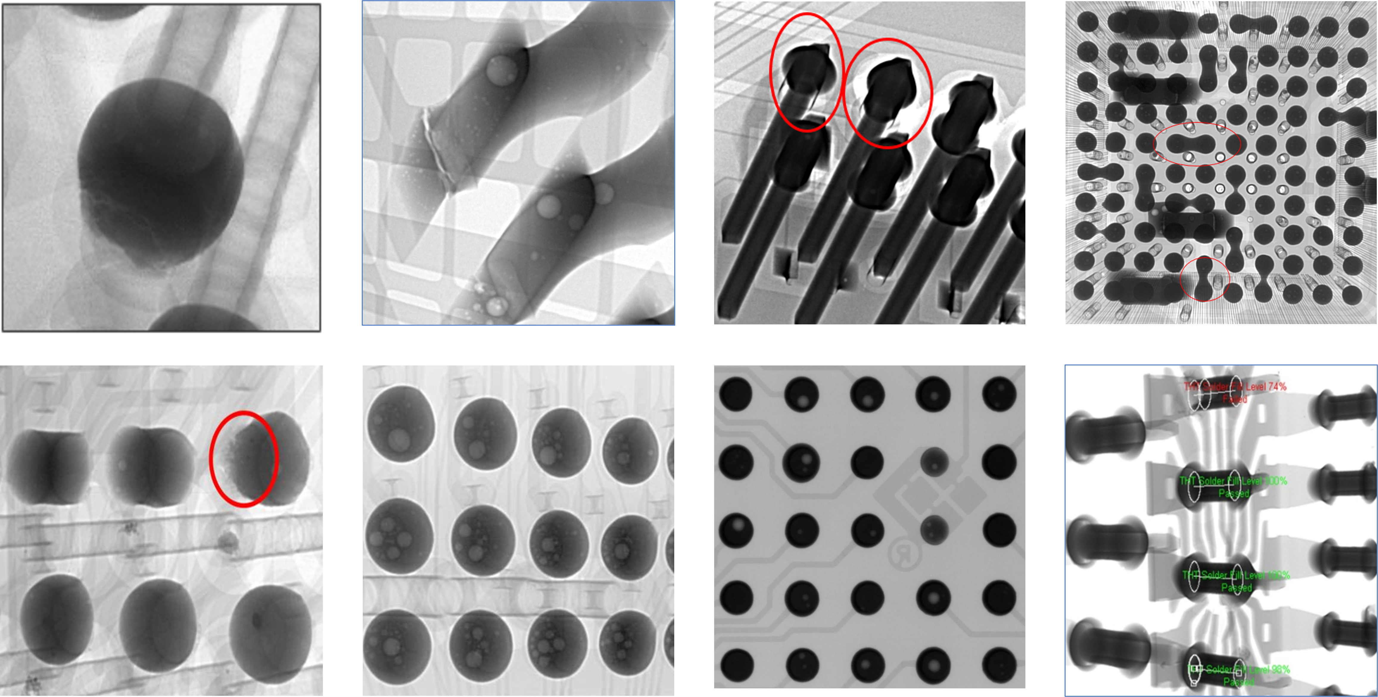 X-ray detection of defects such as solder void, micro-cracks, plated through hole filling, wire bond defects, die adhesion counterfeit and more.